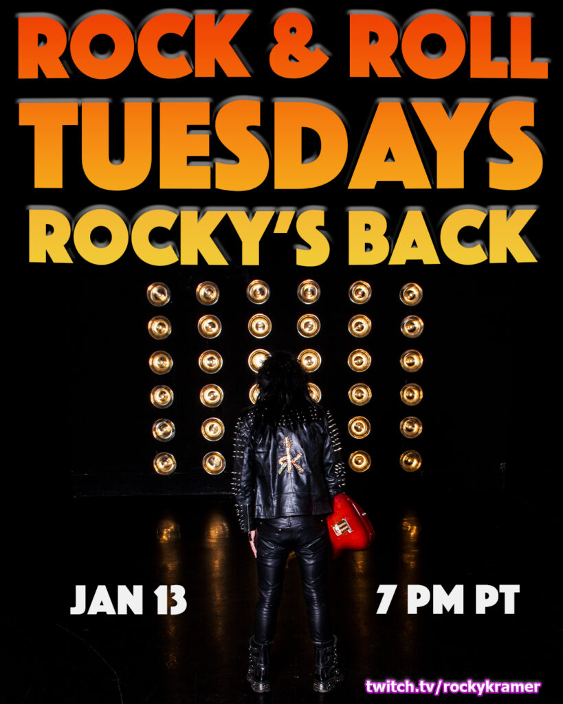 Watch Rocky Kramer’s Rock & Roll Tuesdays “Rocky’s Back” on January 13th, 2026, at 7 PM PT on Twitch here: